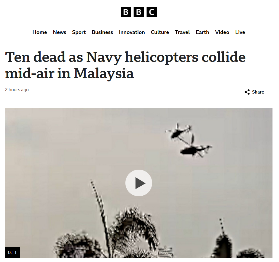 В Малайзии на репетиции военного парада в небе столкнулись два вертолета, которые рухнули на зрителей. Погибли 10 человек.