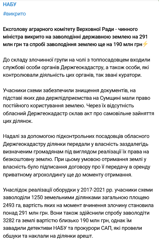 По данным следствия, в 2017-2021 годах Сольский, еще до должности в Кабмине, незаконно завладел государственной землей в Сумской области на 291 млн грн и пытался завладеть землей еще на 190 млн грн.