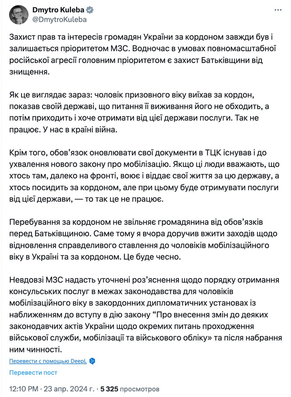 "Как это выглядит сейчас: человек призывного возраста выехал за границу, показал своему государству, что вопрос его выживания его не касается, а потом приходит и хочет получить от этого государства услуги. Если эти люди считают, что кто-то там, далеко на фронте, воюет и отдает свои жизни за это государство, а кто-то посидит за границей, но при этом будет получать услуги от этого государства, — то так это не работает", — написал Кулеба в Х.