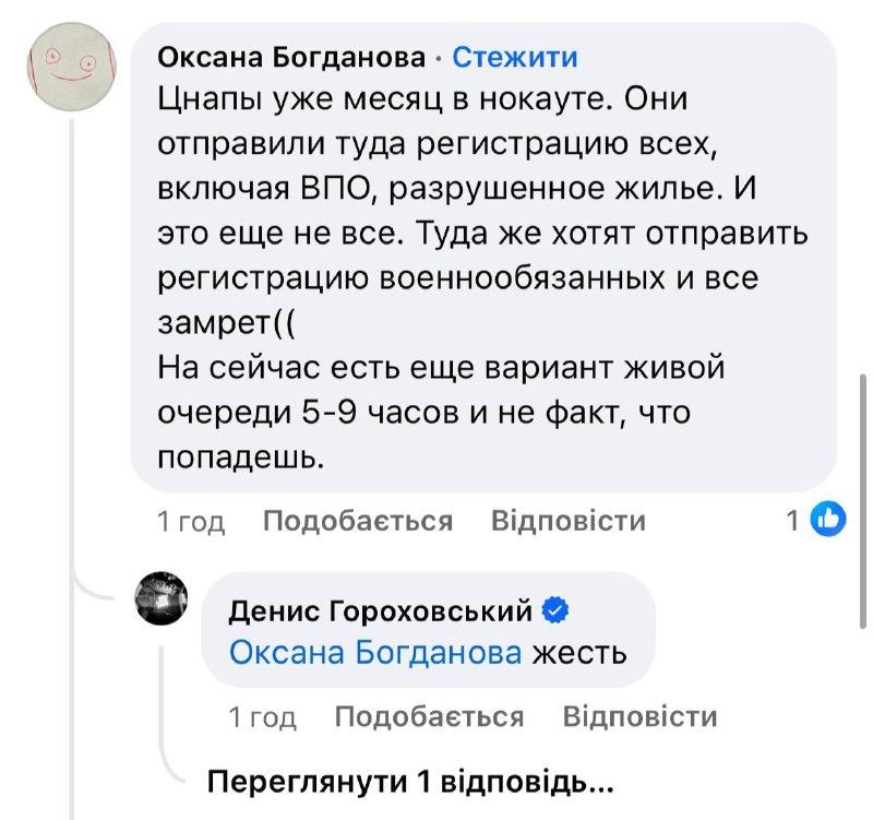 "ЦНАПы уже месяц в нокауте. Они отправили туда регистрацию всех, включая ВПО, разрушенное жилье. И это еще не все. Туда же хотят отправить регистрацию военнообязанных и все замрет. На сейчас есть еще вариант живой очереди — 5-9 часов и не факт, что попадешь", - сообщает один из пользователей.