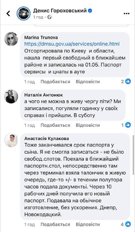 "Тоже заканчивался срок паспорта у сына. Я не смогла записаться — не было свободных слотов. Поехала в ближайший паспортный стол, непосредственно там через терминал взяла талончик в живую очередь, где-то +/- в течении полутора часов подала документы. Через 10 рабочих дней получила его новый паспорт. Подавала на обычное изготовление, без ускорения. Днепр, Новокодацкий", — отмечает пользователь.