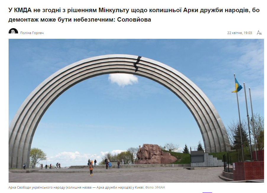 КГГА не хочет сносить бывшую Арку дружбы народов, поскольку она символизирует толерантность украинцев и сдерживает холм, на котором расположена, от смещения.