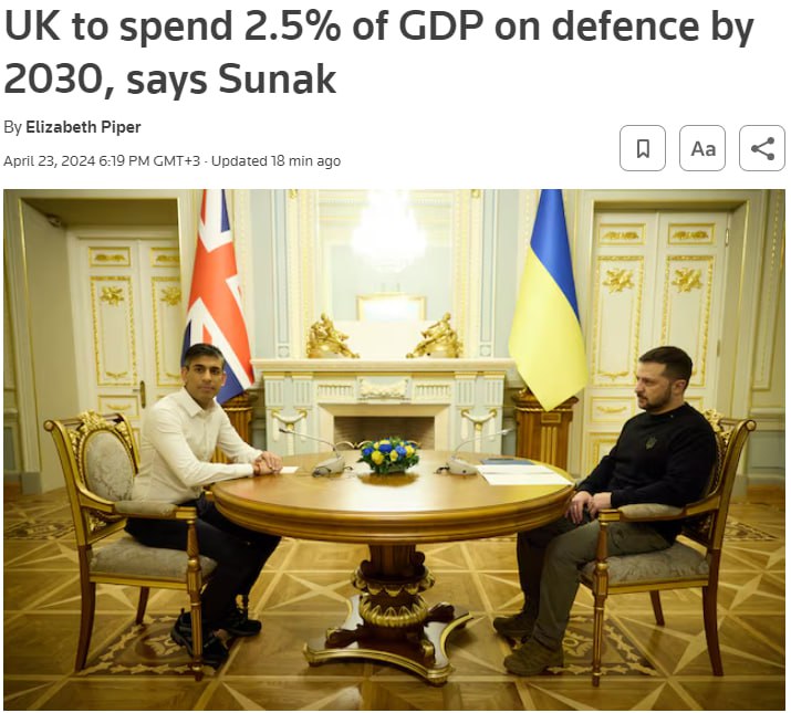 Сунак также заявил, что Великобритания поднимет свои оборонные расходы до 2,5% ВВП, чтобы к 2030 году тратить на эти цели 87 млрд фунтов (около 101 млрд евро).