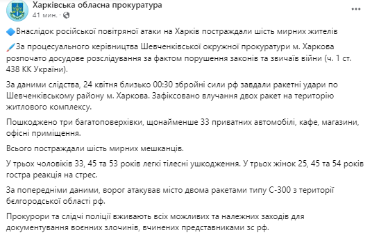 В среду ночью российская военные атаковали Шевченковский район Харькова двумя ракетами С-300. Зафиксирован прилет на территорию жилищного комплекса.