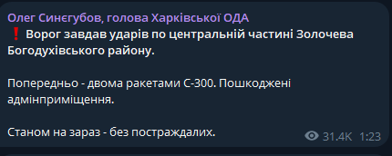 Об этом сообщает глава Харьковской ОВА Олег Синегубов.
