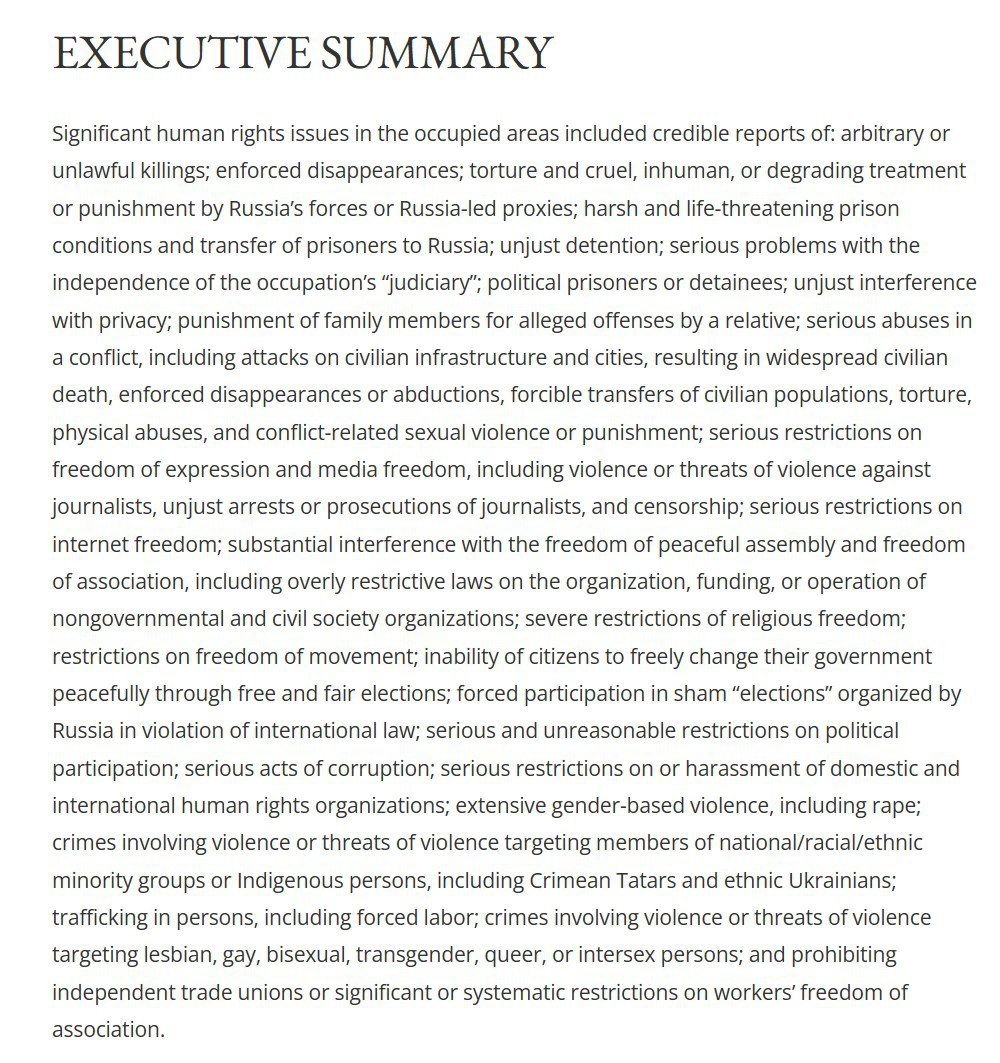Госдепартамент США выпустил отчет по нарушению прав человека на захваченных Россией территориях Украины.