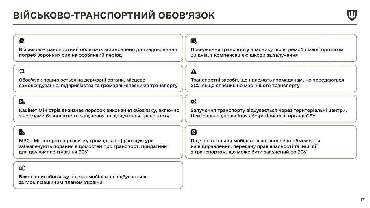 В частности, об обязанностях мобилизуемых, ответственности за необновление данных и неявку в ТЦК, осуществление транспортной повинности и причинах отсрочки.
