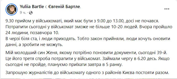 "9:30, прием в военкомате, который должен быть с 9:00 до 13:00, до сих пор не начался. Попасть сегодня в военкомат смогут не больше 10-20 человек. Вчера прошли 24 человека, позавчера 10. В очереди около ста, и люди приходят. То есть закон приняли, люди хотят обновить данные, а сделать не могут", – написала Бартле.