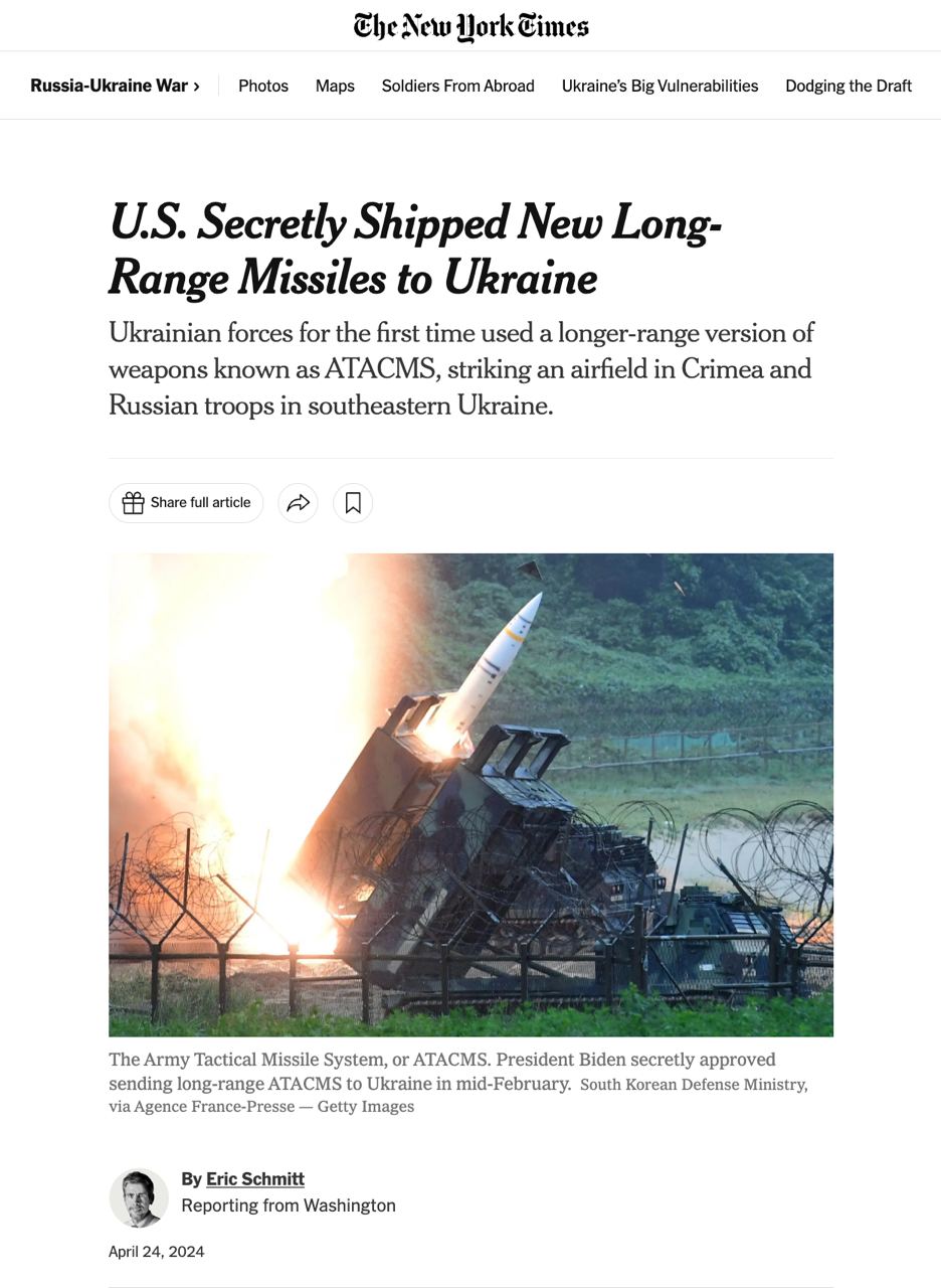 12.25 Украина уже тайно получила более 100 дальнобойных ракет ATACMS и использовала их против РФ, сообщает The New York Times со ссылкой на источники.