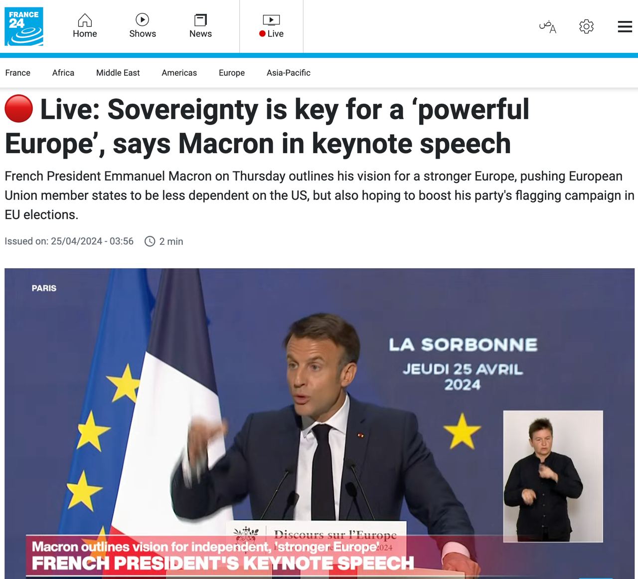 "Наша Европа сегодня смертна и может умереть. Она может умереть, и это зависит только от нашего выбора. Нам необходимо построить эту стратегическую концепцию надежной европейской обороны для себя. Как мы можем построить наш суверенитет, нашу автономию, если мы не возьмем на себя ответственность за развитие нашей собственной европейской оборонной промышленности? Европа должна показать, что она никогда не была вассалом Соединенных Штатов и что она также знает, как разговаривать со всеми другими регионами мира", - заявил Макрон.