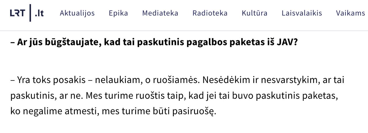 К слову, премьер-министр Литвы Ингрида Шимоните сделала аналогичное заявление в интервью LRT. По ее словам, Запад должен быть готов к тому, что утвержденный Конгрессом США пакет помощи Украине окажется последним.
