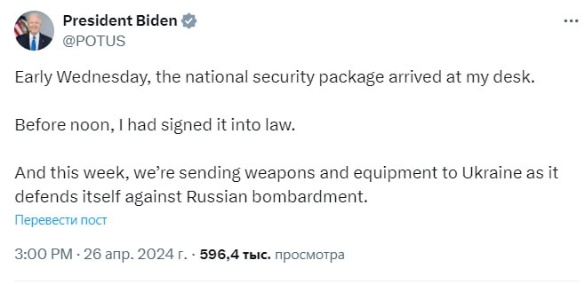 Напомним, 24 апреля президент США Джо Байден подписал закон о помощи Украине и другим союзникам США. Сообщалось, что Вашингтон в ближайшие часы начнет военные поставки Киеву. Речь шла о боеприпасах для ПВО, артиллерии, ракетных системах и бронетехнике.