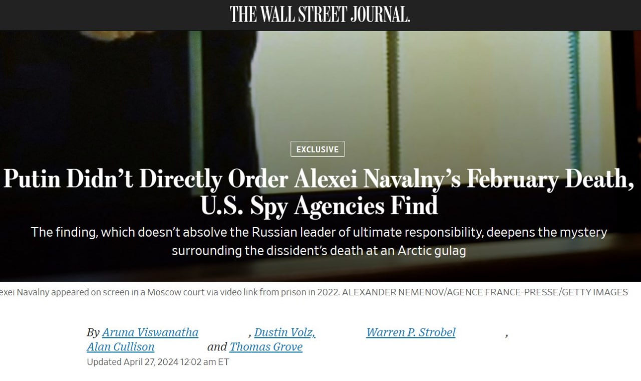 "Путин не отдавал прямого приказа о февральской смерти Алексея Навального", - пишет Wall Street Journal со ссылкой на американскую разведку.