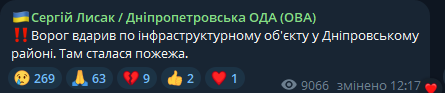 "Враг ударил по инфраструктурному объекту в Днепровском районе. Там возник пожар", - заявил Лысак.