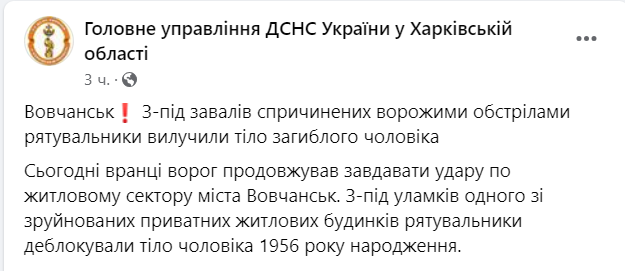 "Сегодня утром враг продолжал наносить удар по жилому сектору города Волчанск. Из-под завалов одного из разрушенных частных жилых домов спасатели деблокировали тело мужчины 1956 года рождения", - говорится в сообщении.