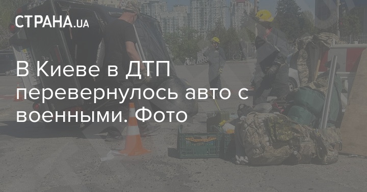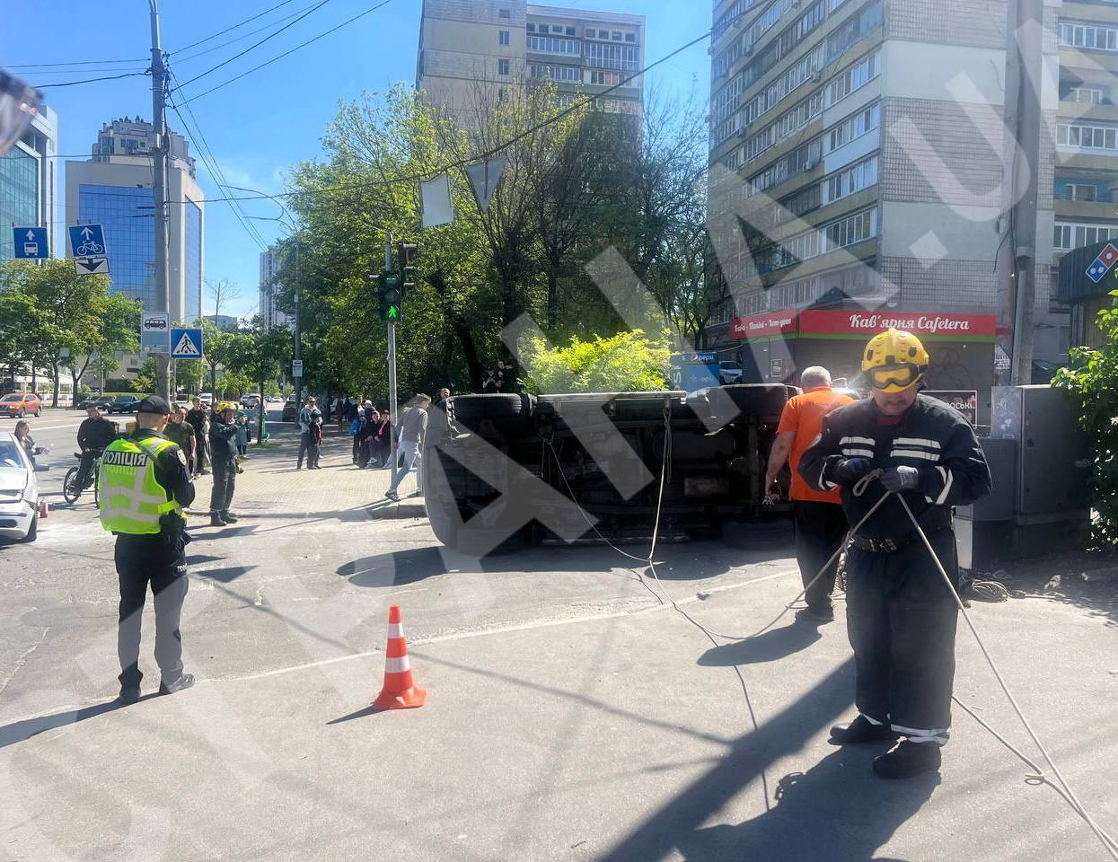В Киеве на пересечении улиц Соломенская и Генерала Шаповала в результате ДТП перевернулся автомобиль с военными.