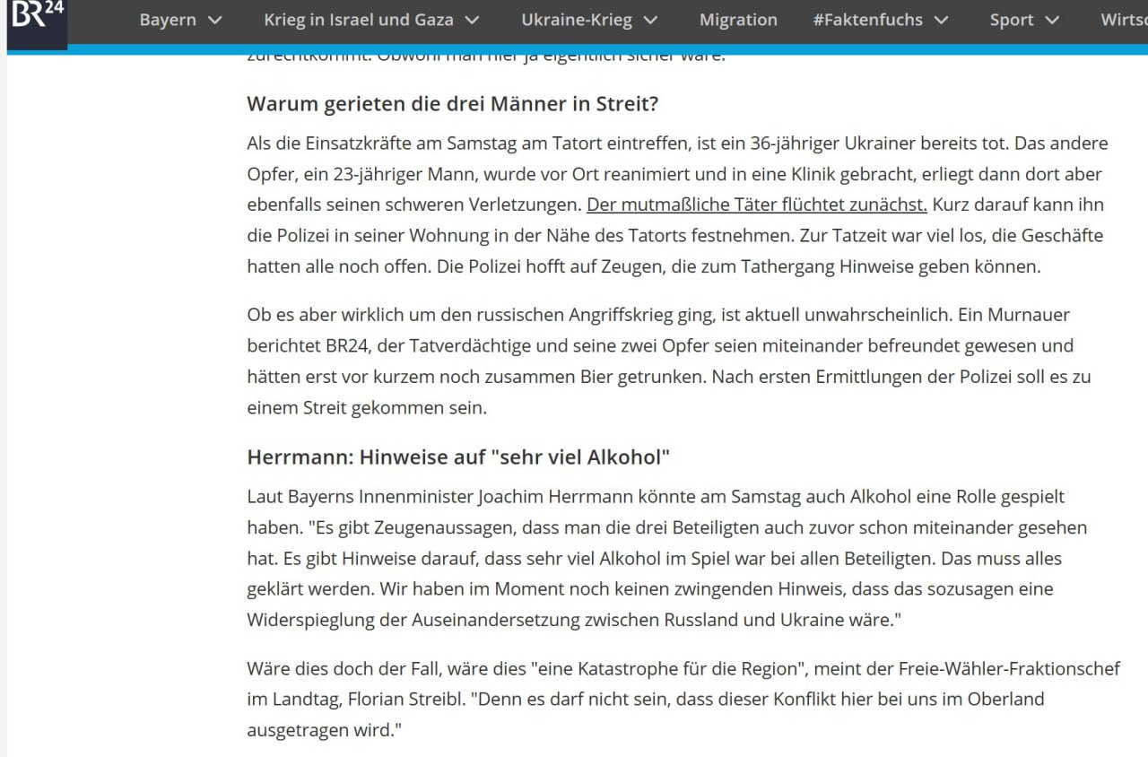 "Есть показания свидетелей о том, что троих причастных к этому людей уже видели вместе раньше. Есть признаки того, что все причастные принимали большое количества алкоголя. Это все необходимо уточнить. На данный момент у нас нет убедительных доказательств того, что этот кейс был отражением конфликта между Россией и Украиной", - заявил министр внутренних дел Баварии Йоахим Херрманн.