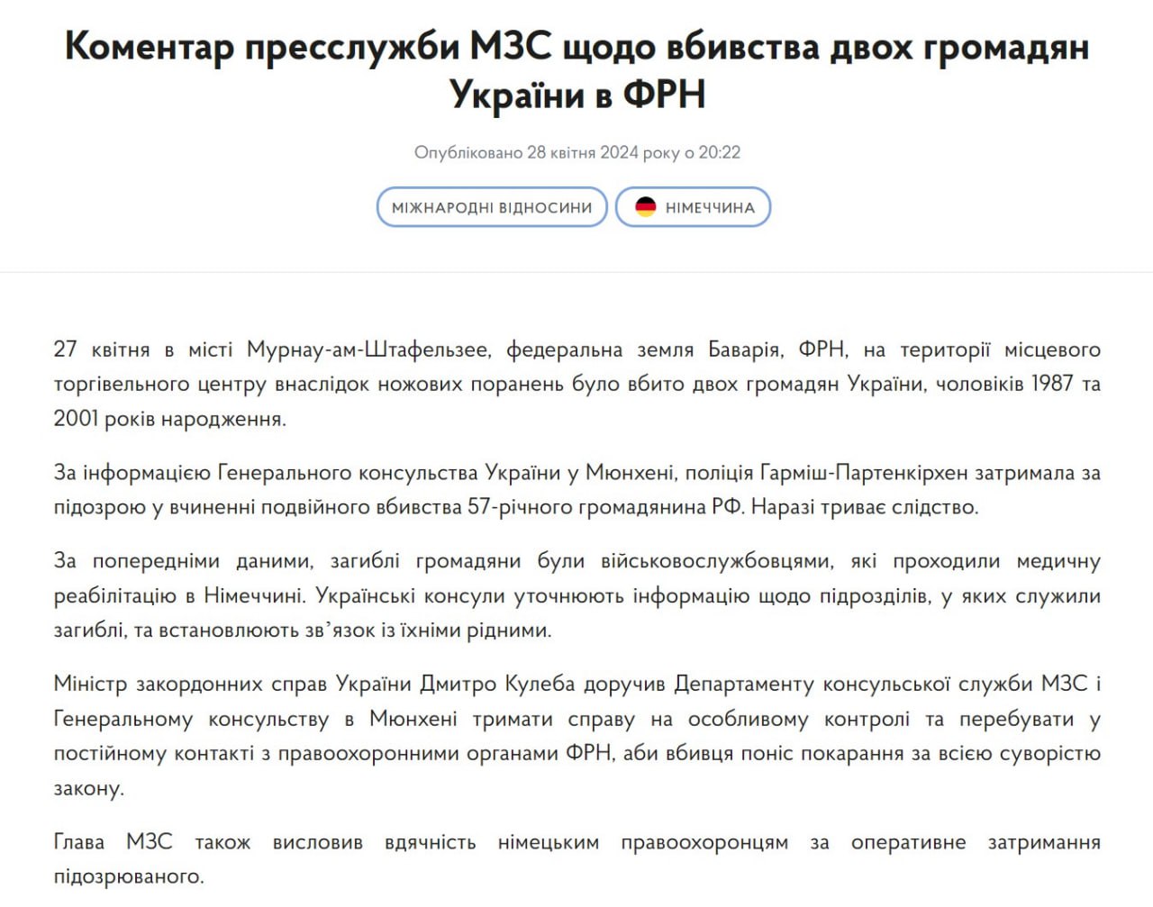 "По предварительным данным, погибшие граждане были военнослужащими, проходившими медицинскую реабилитацию в Германии. Украинские консулы уточняют информацию о подразделениях, где служили погибшие, и устанавливают связь с их родными", - говорится в заявлении ведомства.
