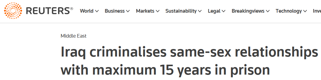 Парламент Ирака принял закон, криминализирующий однополые отношения в стране. Он вводит наказание для представителей ЛГБТ в виде лишения свободы сроком от 10 до 15 лет.