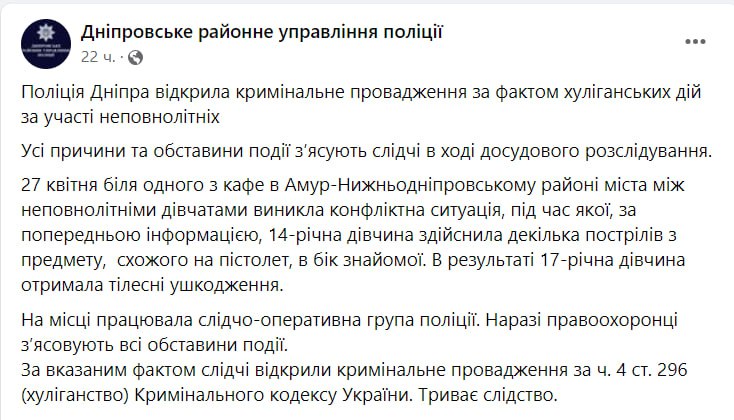 По его информации, 27 апреля возле одного из кафе в Амур-Нижнеднепровском районе города между несовершеннолетними девушками возникла конфликтная ситуация, во время которой, по предварительной информации, 14-летняя девушка произвела несколько выстрелов из предмета, похожего на пистолет, в сторону знакомой.