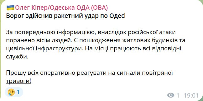 Об этом сообщает в телеграм-канале глава Одесской ОВА Олег Кипер.