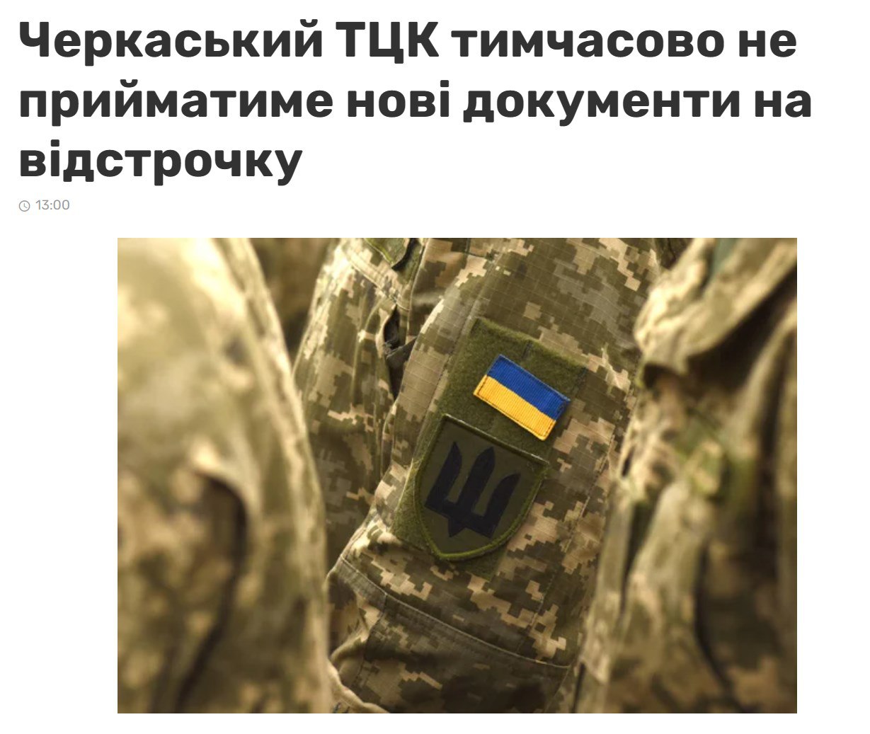 07.58 Черкасский ТЦК прекратил прием документов на отсрочку от мобилизации - до вступления в силу нового закона, который ее ужесточает.