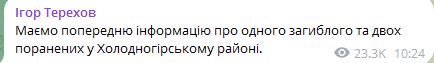 Как сообщает мэр Игорь Терехов, в Харькове один погибший и двое раненых после прилетов в Холодногорском районе.