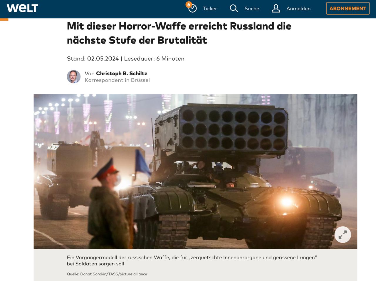 "С этим ужасным оружием Россия выходит на новый уровень жестокости", - пишет издание.