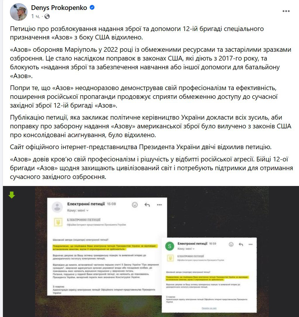 Бригаду "Азов" по-прежнему не допускают к получению помощи США, и у президента отказались решать этот вопрос.