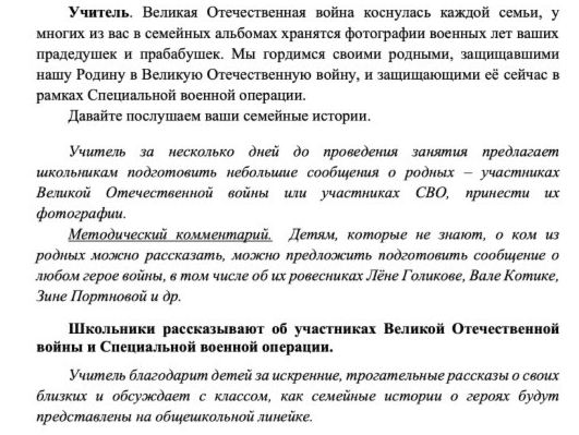 Кроме того, школьникам дадут задание сделать доклад о родственниках, воевавших либо во Вторую мировую, либо в нынешней войне с Украиной.