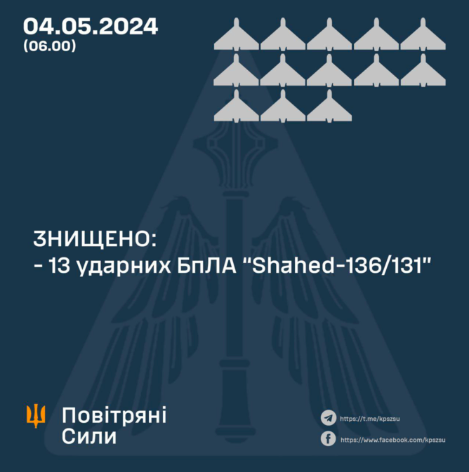 Воздушные силы при этом заявили, что сбили все 13 дронов, которые атаковали Украину.