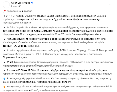 В ночь на 4 мая 2024 года россияне атаковали Украину 13-ю ударными БПЛА типа "Shahed-131/136" и четырьмя зенитными управляемыми ракетами С-300. Все пуски производились из Белгородской области.