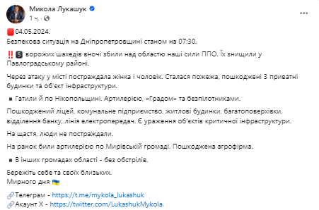 "5 вражеских "Шахедов" ночью сбили над областью наши силы ПВО. Они были уничтожены в Павлоградском районе. Из-за атаки в городе пострадала женщина и мужчина. Произошел пожар, повреждены 3 частных дома и объект инфраструктуры", - сообщил глава.
