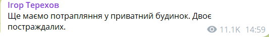 Также мэр Харькова Игорь Терехов сообщил о попадании в частный дом, пострадали два человека.