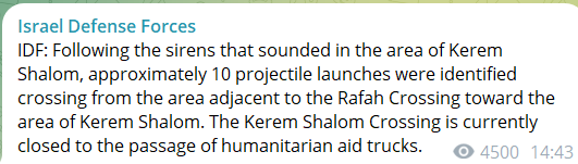 "После сирен, прозвучавших в районе Керем-Шалом, было зафиксировано около десяти пусков снарядов, пересекших территорию, прилегающую к контрольно-пропускному пункту "Рафах", в направлении района Керем-Шалом. КПП "Керем Шалом" в настоящее время закрыт для проезда грузовиков с гуманитарной помощью", - говорится в сообщении телеграм-канала ЦАХАЛ.
