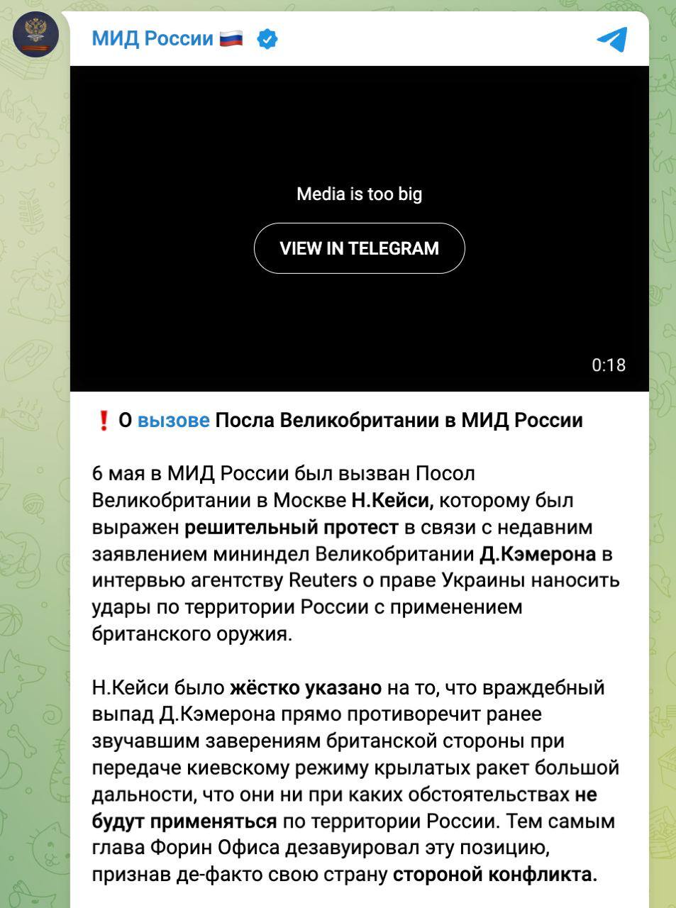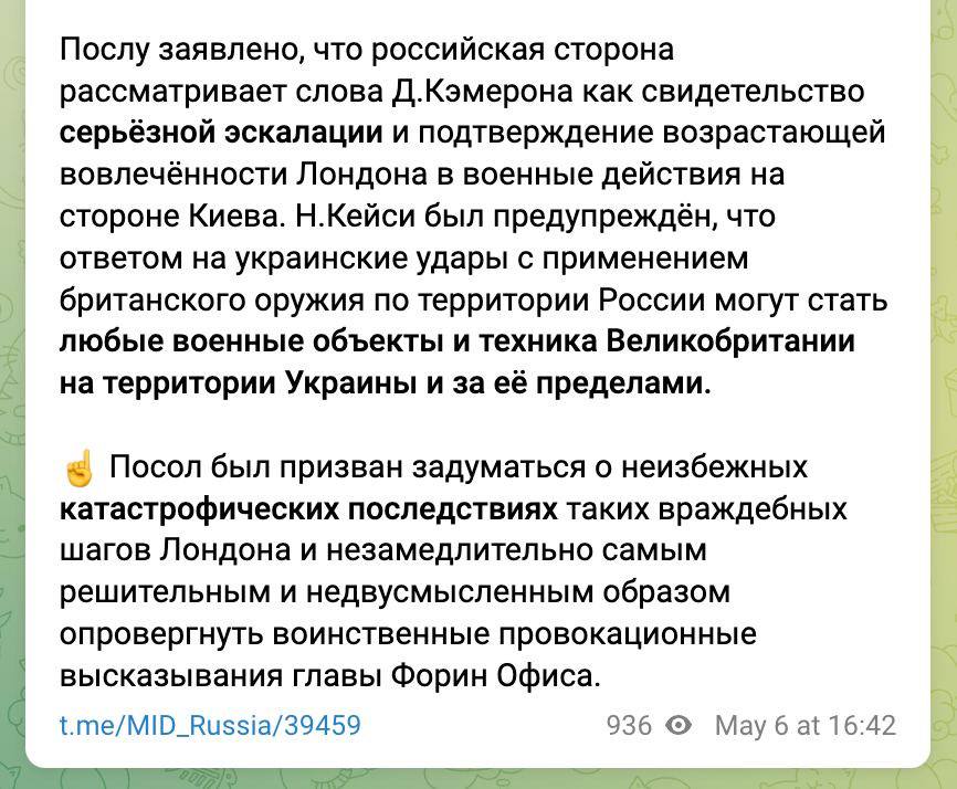 Напомним, глава МИД Дэвид Кэмерон заявил, что Украина может наносить удары по территории РФ переданным Британией оружием.