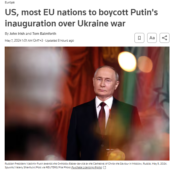 Один из европейских дипломатов на условиях анонимности сообщил агентству, что 20 стран - членов ЕС будут бойкотировать инаугурацию кремлевского правителя.