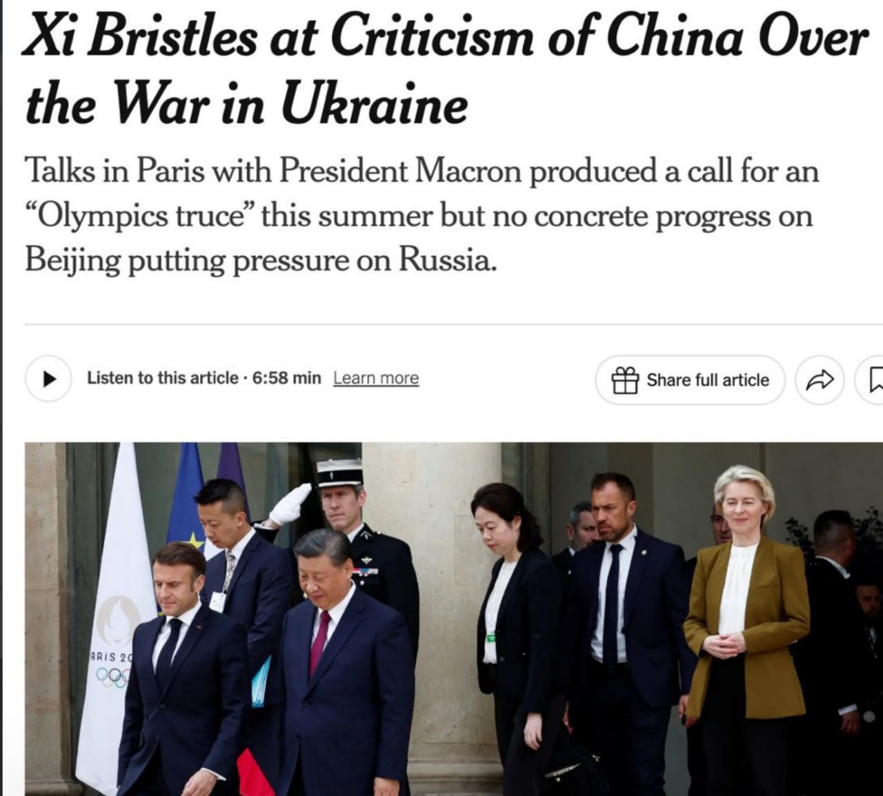 Президент Франции Эммануэль Макрон и глава Еврокомиссии Урсула фон дер Ляйен оказывали давление на лидера Китая, чтобы тот использовал свое влияние на Москву и положил конец войне. Но не было никаких намеков - кроме общего пожелания мира - на то, что он попросит своего союзника "без ограничений" прекратить войну.