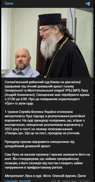 Напомним, 1 мая, СБУ вручила подозрение запорожскому митрополиту УПЦ Луке за разжигание религиозной ненависти. На суде прокурор сообщил, что, согласно экспертизе, священник разжигал ненависть в 2022 году в посте на своем телеграмм-канале Лекарь.zp. Что это за пост, прокурор не уточнил. Прокурор просил отправить священника под круглосуточный домашний арест. Сам Лука не признал вину и просил оставить его на свободе.