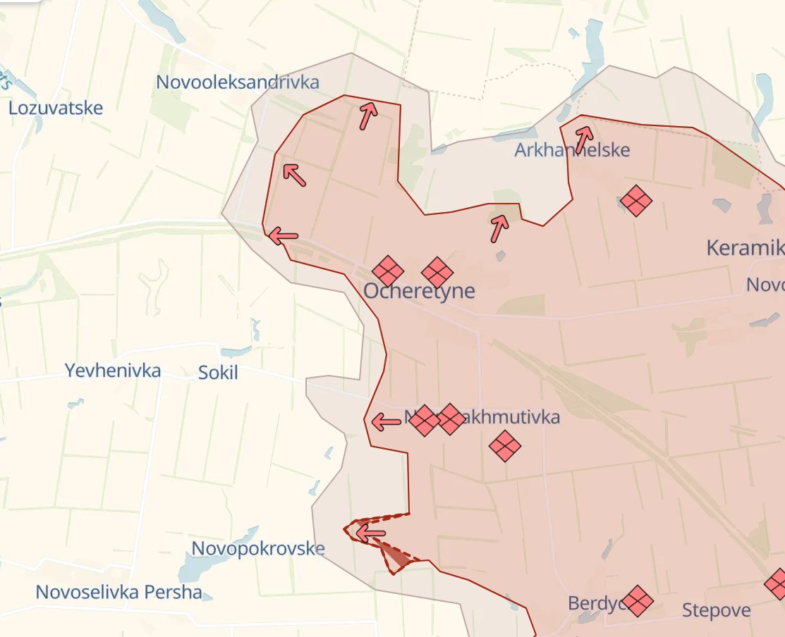 Это село южнее Очеретинского выступа, где серьезно продвинулись россияне. При этом, судя по динамике последних дней, рост самого выступа замедлился - вместо этого идет работа по укреплению и расширению его флангов.