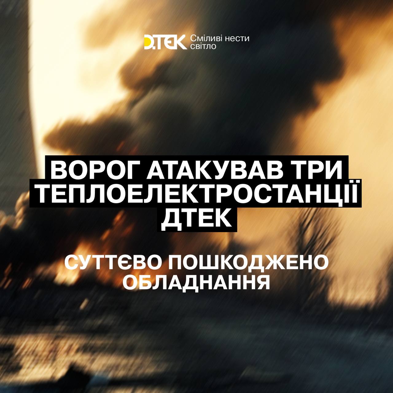 Сегодня ночью россияне атаковали три теплоэлектростанции ДТЭК. Существенно повреждено оборудование, энергетики работают над ликвидацией последствий атаки.
