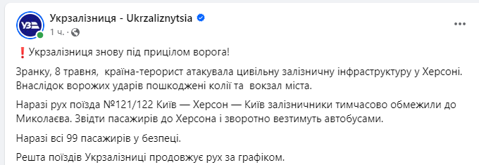 "В настоящее время движение поезда №121/122 Киев — Херсон — Киев железнодорожники временно ограничили Николаев. Оттуда пассажиров в Херсон и везти автобусами. В настоящее время все 99 пассажиров находятся в безопасности" - говорится в сообщении.