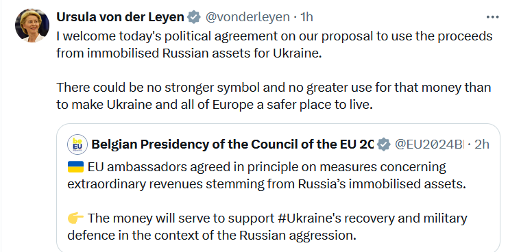 "Я приветствую сегодняшнее соглашение по нашему предложению использовать доходы от замороженных российских активов для Украины", - написала председатель Еврокомиссии Урсула фон дер Ляйен в соцсети X.