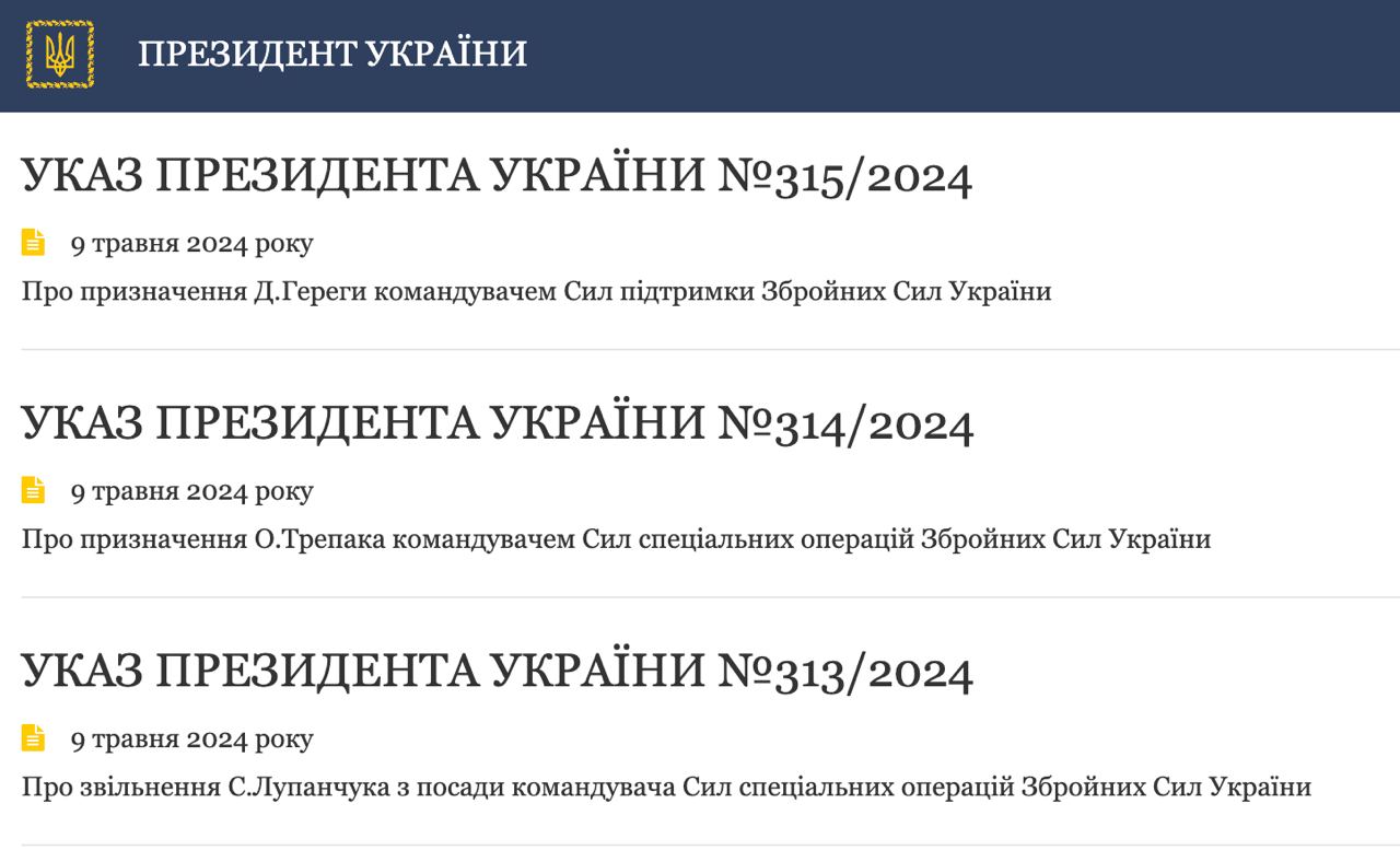 "Уволить Лупанчука Сергея Константиновича с должности командующего Сил специальных операций Вооруженных сил Украины", - говорится в указе №313/2024.