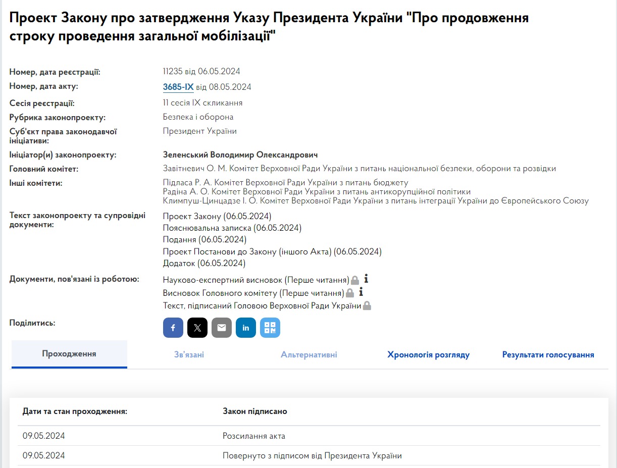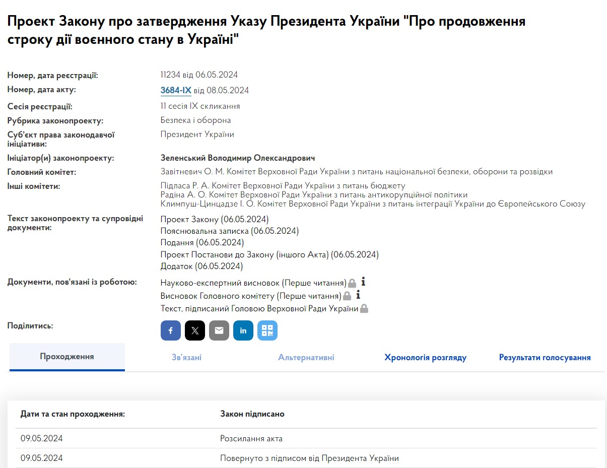 Срок действия особого правового режима военного положения продлевается на 90 дней – до 11 августа 2024 года. Это уже одиннадцатая пролонгация после 24 февраля 2022 года.