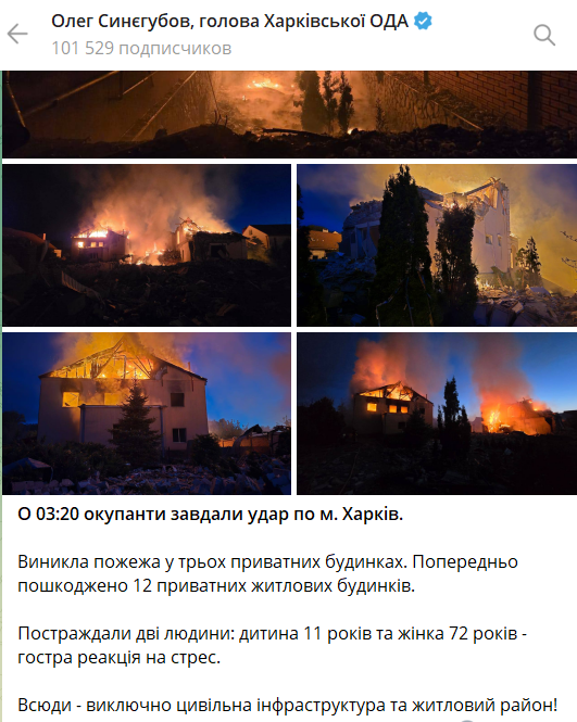 "В 03:20 оккупанты нанесли удар по Харькову. Возник пожар в трех частных домах. По предварительным данным, повреждены 12 частных жилых домов. Пострадали два человека: ребенок 11 лет и женщина 72 лет – острая реакция на стресс", - говорится в сообщении.