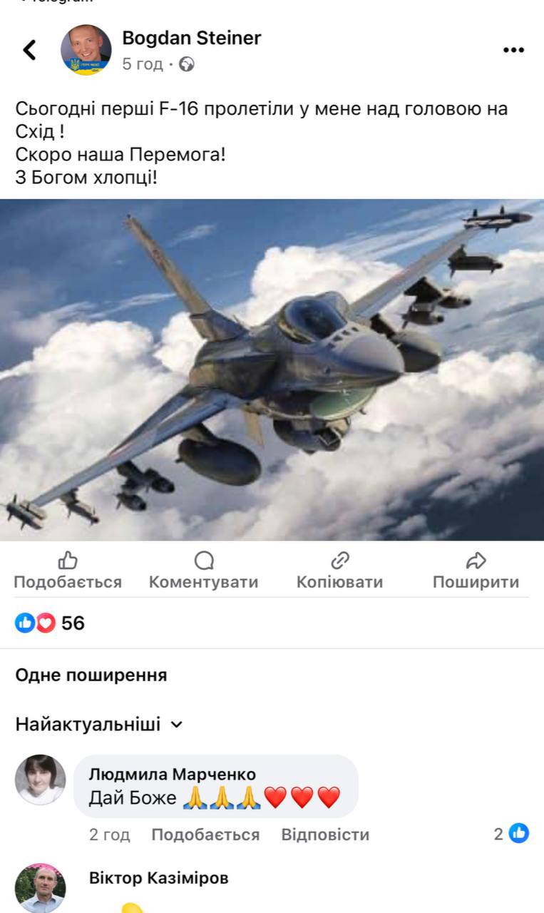 "Сегодня первые F-16 пролетели у меня над головой на восток", – написал в соцсети житель Закарпатья Богдан Штайнер.