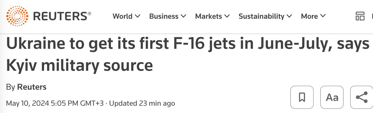 Между тем агентство Reuters со ссылкой на высокопоставленный украинский военный источник сообщило, что Украина рассчитывает получить первые F-16 в июне-июле. В ВСУ рассказали, что некоторые украинские пилоты уже завершают подготовку.