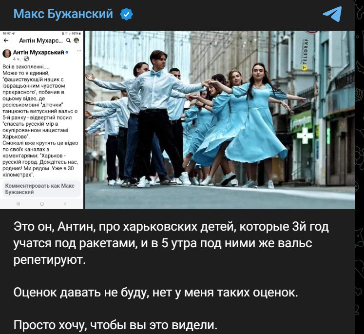 "Может, я единственный "фашиствующий нацик с извращенным чувством прекрасного", кто увидел в этом видео, где русскоязычные "детки" танцуют выпускной вальс в 5 утра – откровенный посыл "спасать русский мир в оккупированном нацистами Харькове", – написал Мухарский.