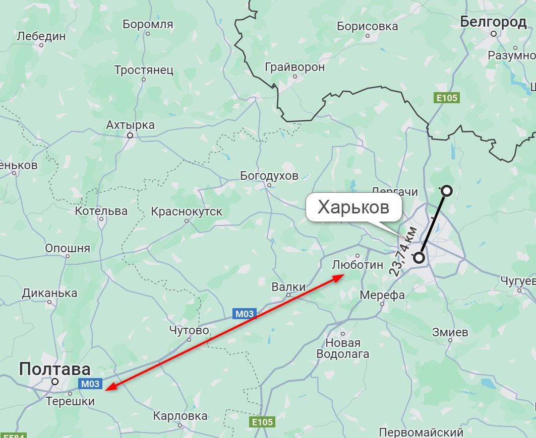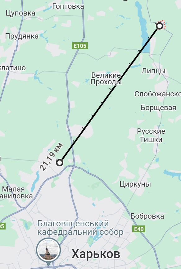 Деревня Глубокое в серой зоне, за нее продолжаются бои (в тоже время российские паблики утверждают, что армия РФ ее уже захватила). Оттуда до Липцов менее пяти километров. А до северных окраин Харькова по прямой - 21 километр, что уже позволяет наносить удары из ствольной артиллерии (о чем мы еще скажем ниже).